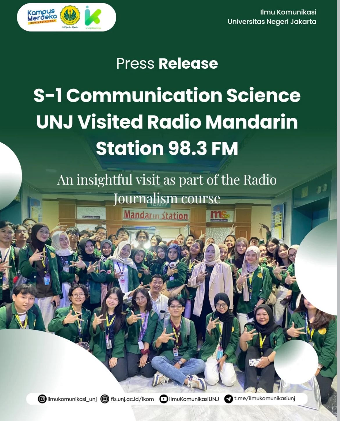 Berikut merupakan kegiatan yang dilaksanakan oleh Mahasiswa Program Studi S1 Ilmu Komunikasi Universitas Negeri Jakarta yang merupakan implementasi Kurikulum Merdeka Belajar yang berdampak. Melalui program magang berbasis dampak, pembelajaran berbasis proyek dalam mata kuliah, serta keterlibatan aktif mahasiswa dalam Badan Eksekutif Mahasiswa, dan unit kegiatan mahasiswa. Mahasiswa memperoleh pengalaman belajar kontekstual yang mendorong pengembangan kompetensi, kepemimpinan, dan kesiapan profesional. Kegiatan kolaboratif, pameran karya, serta kunjungan industri menjadi bagian dari pembelajaran berbasis capaian yang memberikan dampak nyata bagi mahasiswa dan penguatan kualitas lulusan..